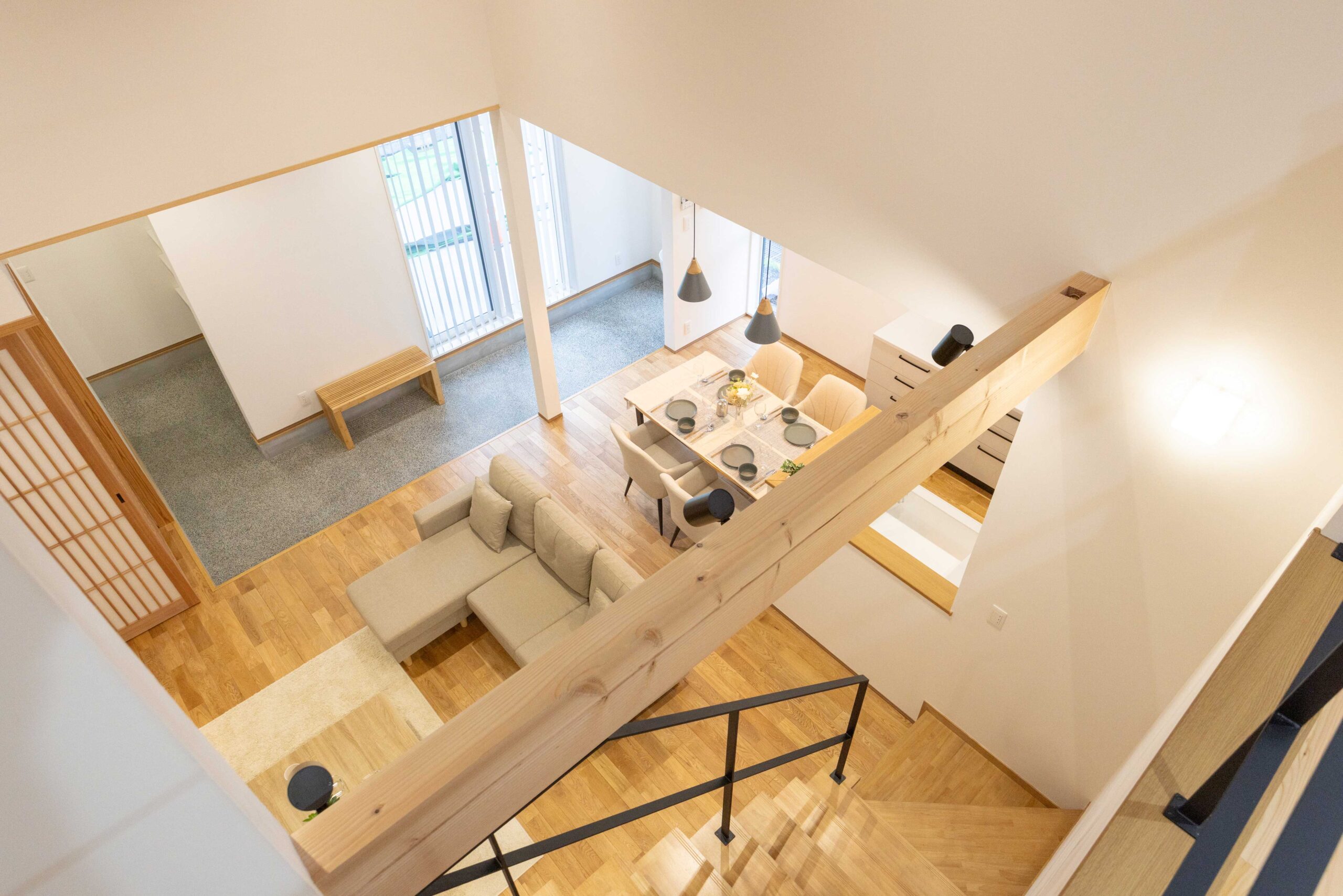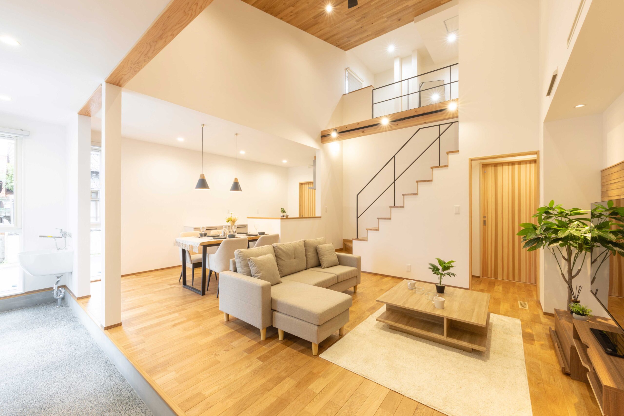 15.9帖のリビングダイニングは、吹抜けが上下に光と風を通す心地よい空間。板張りの天井、自然素材の床材がやさしく包み込み、時間をゆっくりと感じられるリビングです。